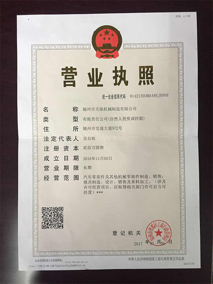 隨州市天銘機(jī)械制造有限公司地處中國(guó)專用汽車之都、炎帝神農(nóng)故里、編鐘古樂(lè)之鄉(xiāng)、歷史文化名城圣地車都—---隨州,是2015創(chuàng)立的新興企業(yè);主要生產(chǎn)汽摩配、機(jī)械設(shè)備系列鋁合金零部件的專業(yè)化公司,具有年產(chǎn)各類零部件10萬(wàn)臺(tái)套的生產(chǎn)能力;公司致力于發(fā)展智能化,自動(dòng)化汽車配套產(chǎn)品。目前已有智能高壓灑水炮產(chǎn)品,并獲得兩項(xiàng)國(guó)家專利(實(shí)用新型專利 專利號(hào):ZL 2016 2 0962285.1 外觀設(shè)計(jì)專利 專利號(hào):ZL 2016 3 0428566.4 )。公司著重以減輕人力操作強(qiáng)度為發(fā)展方向,升級(jí)產(chǎn)品,升級(jí)工藝。向技術(shù)要效益,向工藝要產(chǎn)值,向品質(zhì)要客戶!努力實(shí)現(xiàn)上中下游共贏!